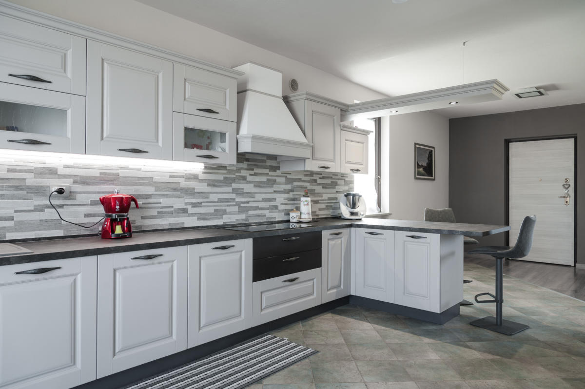 La forma della porta richiama le cucine classiche , la verniciatura Creta la rende un prodotto più moderno;