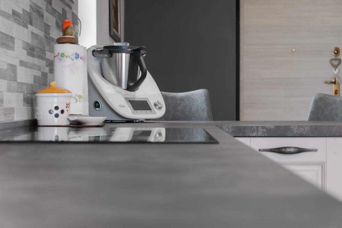 Cucina Smart collection by NovaCucina, piano in quarzo collezione marmorea by Stone Italiana , elettrodomestici Hotpoint , Lavello Elleci Keratek plus e miscelatore Grohe, cappa Elica Haiku. Carta da parati Instabilelab